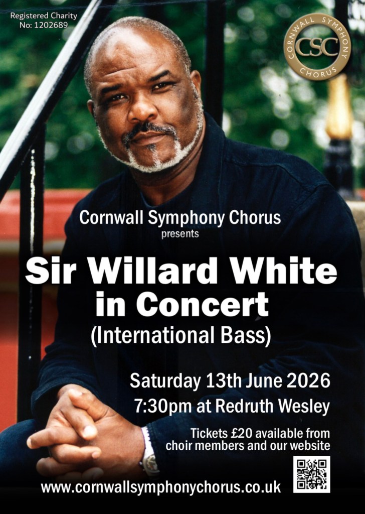 Cornwall Symphony Chorus are extremely honoured and very proud to be able to present Sir Willard White, one of the best loved and most versatile opera stars of the last 40years, to you as their guest. The evening promises classical favourites such as “Beauty and the Beast”, “Love Never Dies” plus the hauntingly beautiful “Anthem” (Chess) from the Chorus. With Sir Willard White also performing some of his well known classics including one of his most famous pieces “Ol’ Man River” from the musical Showboat, the evening promises to be a Concert to remember with an opportunity to listen, in person, to one of the world’s superlative and incomparable voices.