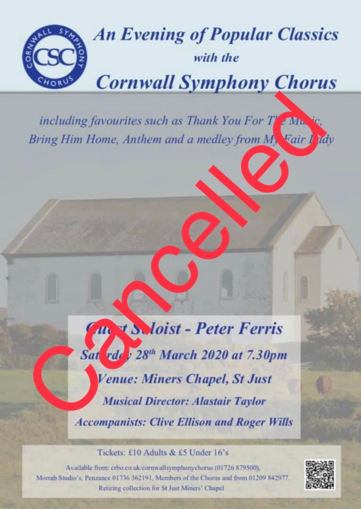 Sadly we have to announce that the Concert due to be held on Saturday 28th March at the Miners Chapel, St Just has been cancelled. For further details regarding ticket refunds please contact the Treasurer; Alice Allsworth – 07870 676412.