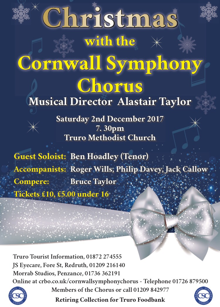 The long awaited 2018 Christmas concert will soon be upon us and the Chorus are busy in rehearsals to present another fantastic evening. Held again at Truro Methodist Church, the Concert will be on Saturday 1st December at 7.30pm. Tickets can be purchased through Truro Tourist Information Centre (01872 274555), via Chorus members or on 01209 842977 or online at crbo.co.uk/cornwallsymphonychorus (01726 879500). All details are provided on the poster.